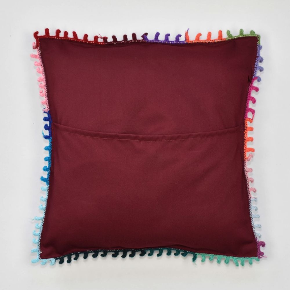this magnificent cushion cover displays summer-tone floral motifs that evoke spring. At the center, a big flower frames some of the flowers. To craft this cover, our artisans first hand-weaves it of wool on the traditional telar de pedal, or floor loom. Then, embroidered and crochets the colorful designs by hand. At the back, this cover features a solid color , complete with a slit for inserting a cushion