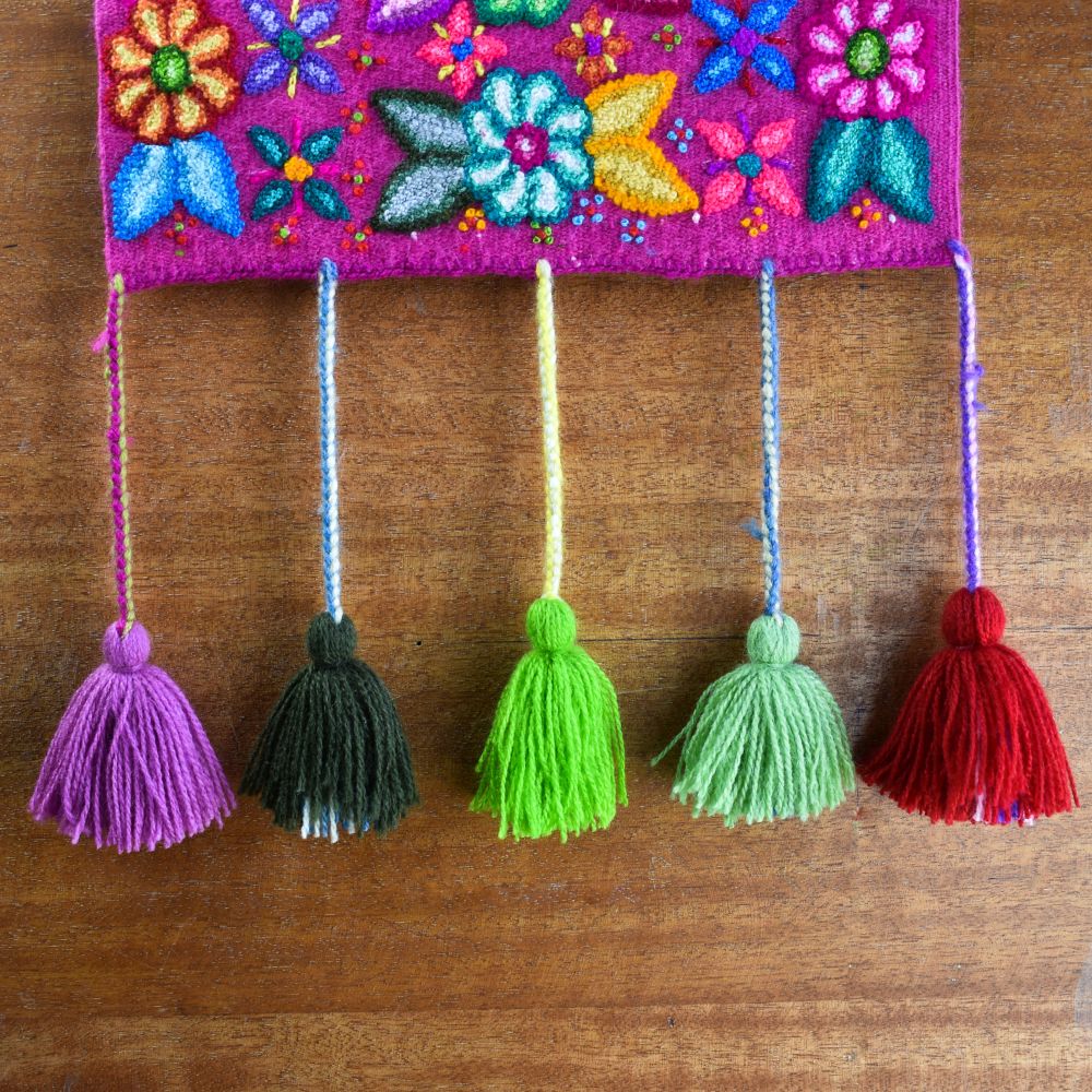 This exquisite table runner is designed and hand crafted from alpaca blend . The runner features hand embroidered flowers, leaves and birds. Long tassels adorn each end.